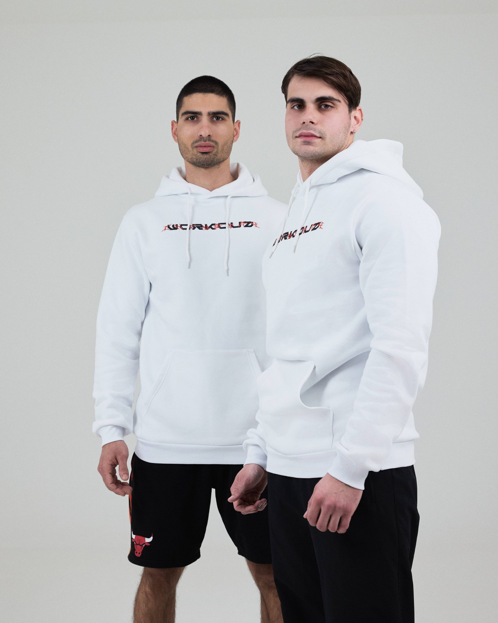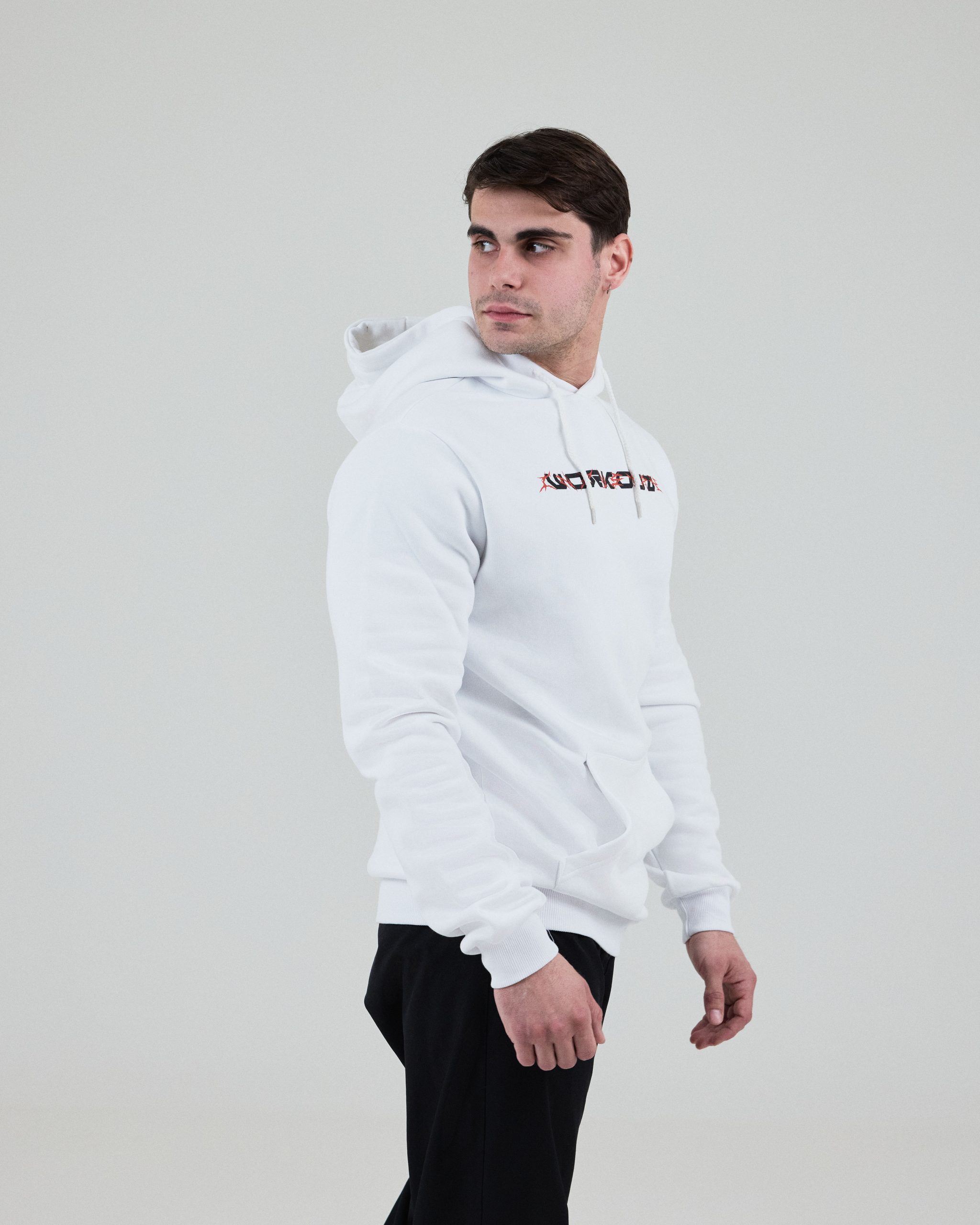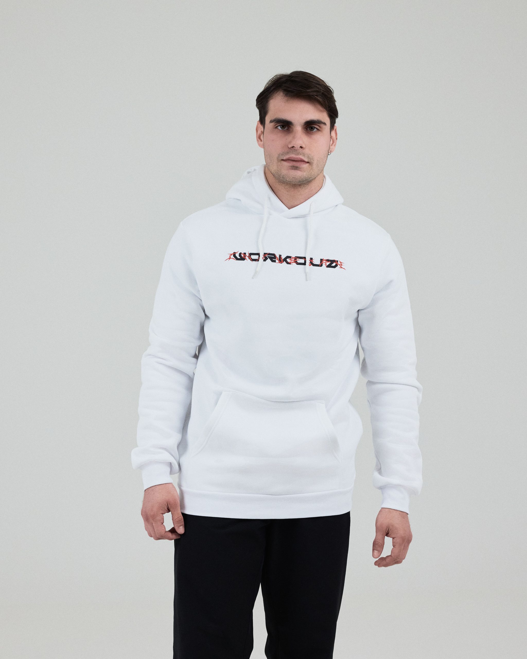 Λευκή unisex μπλούζα M/M με κουκούλα, τύπωμα πίσω και μπροστινή τσέπη