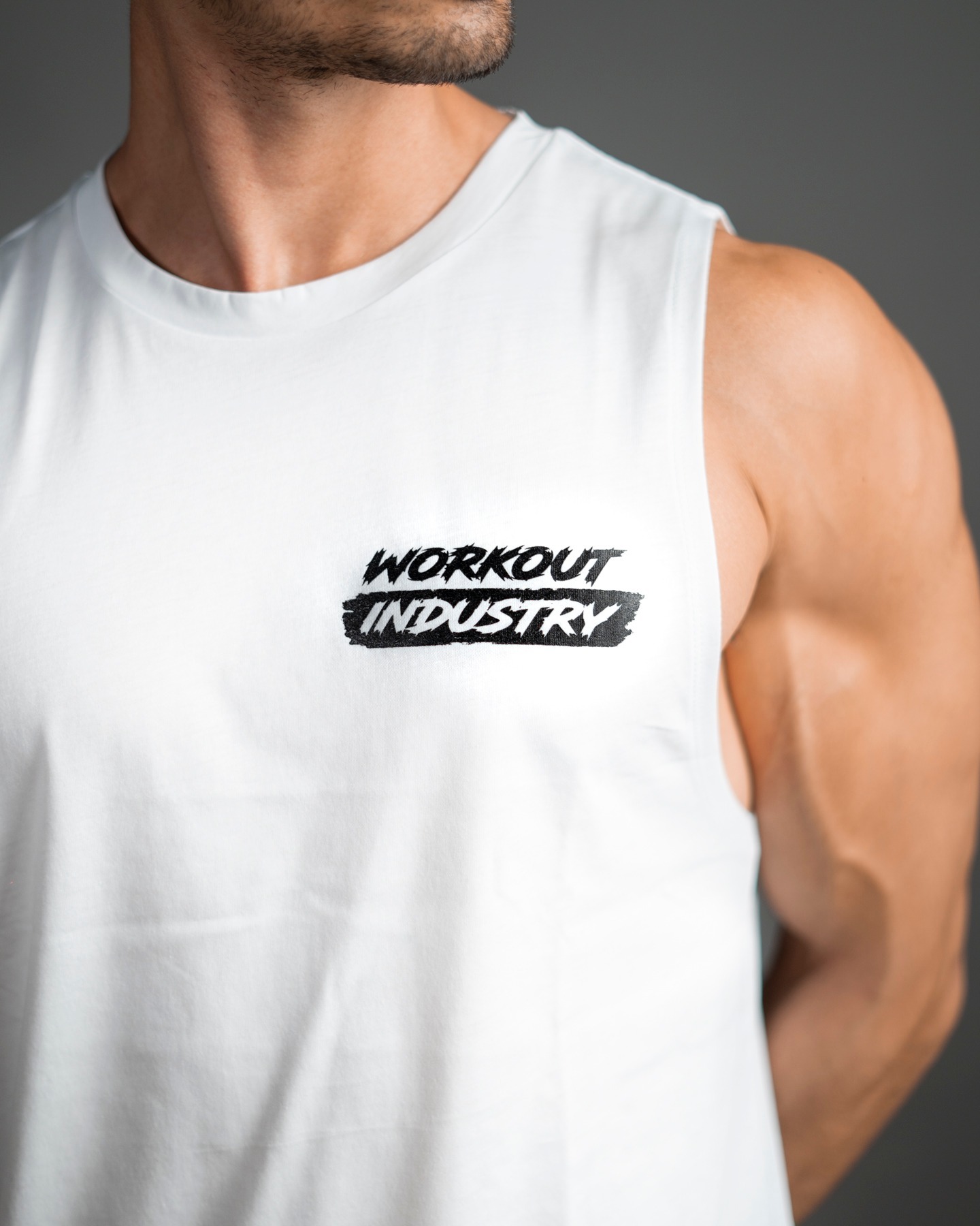 Unisex λευκή αμάνικη μπλούζα Κ/Μ με στρογγυλή λαιμουδιά, τύπωμα “Workout Industry” εμπρός και τύπωμα “Trust The False Grip” πίσω